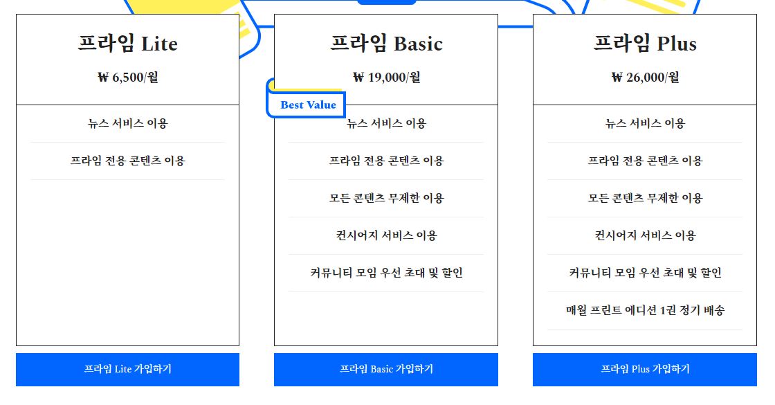 ์ ๊ฐ ์์ํ ํ๋ผ์ ๋ผ์ดํธLite, ํ๋ผ์ ๋ฒ ์ด์งBasic, ํ๋ผ์ ํ๋ฌ์คPlus ์ ๋๋ค. ํ๋ผ์ ๋ผ์ดํธ๋ ์ 6,500์, ๋ฒ ์ด์ง์ 19,000์, ํ๋ฌ์ค๋ 26,000์์ ๋๋ค.